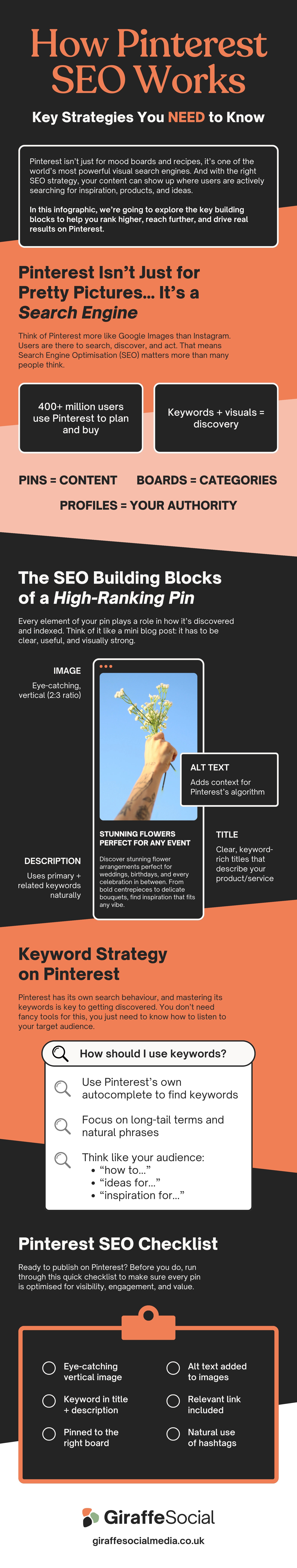 Save our comprehensive infographic below for a quick reference guide you can return to whenever you’re creating new pins. It includes all the essential optimisation elements in an easy-to-follow checklist format, ensuring every pin maximises your visibility and engagement potential.